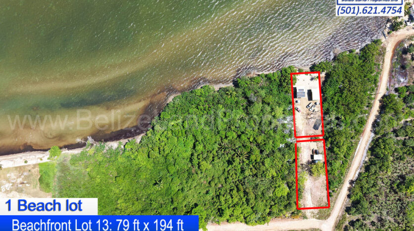 The package sale on this great piece of real estate in Belize is for 2 cabanas on a beachfront lot, with 79 feet of beachfront and an average depth of approximately 194 feet.  In addition to the beachfront lot, the sale includes a beach-view lot.  The beach-view lot is an average size of 79 feet by 148 feet.