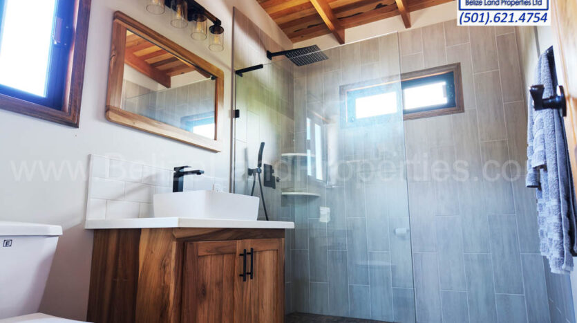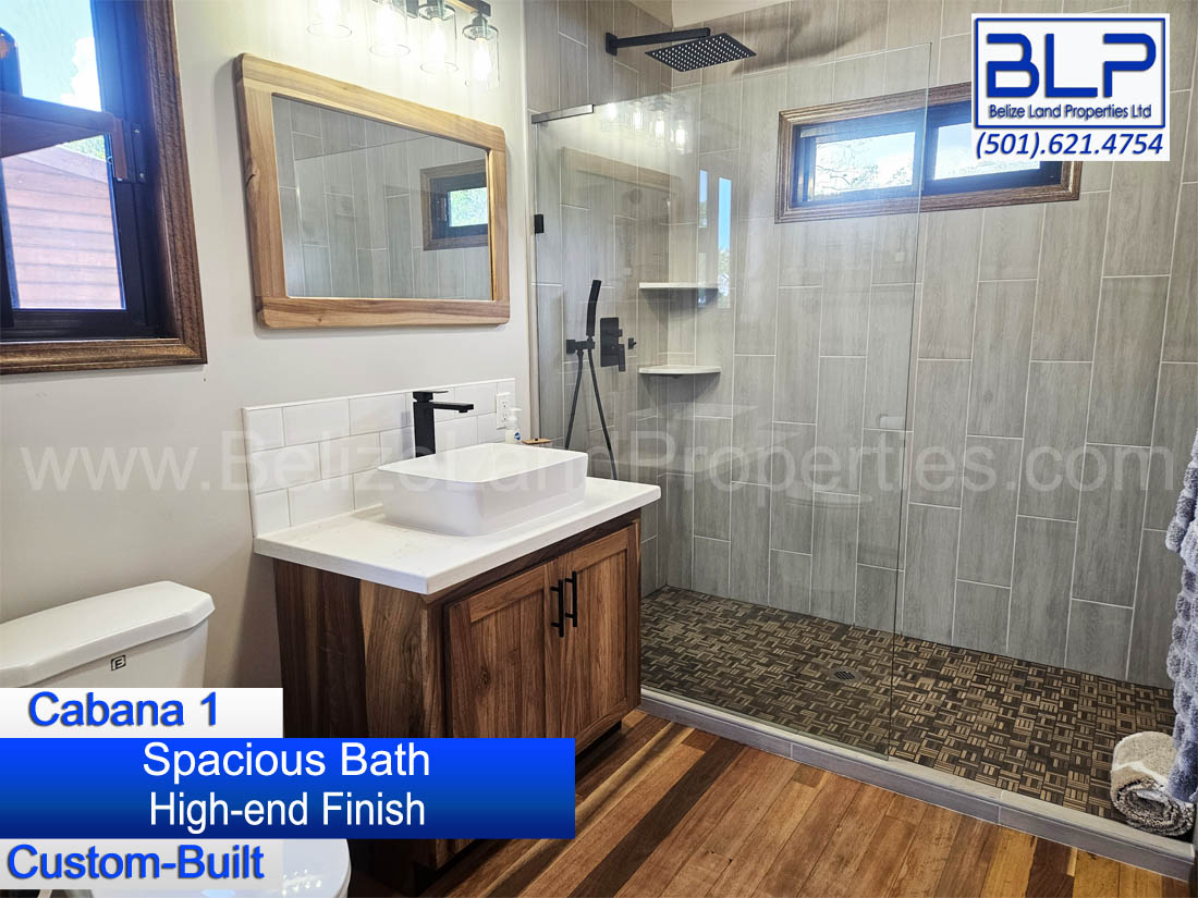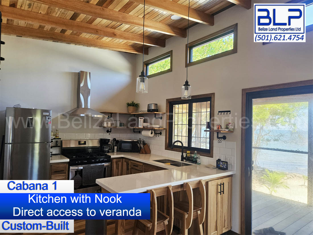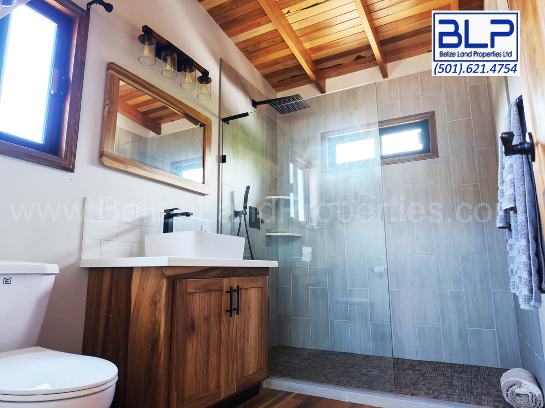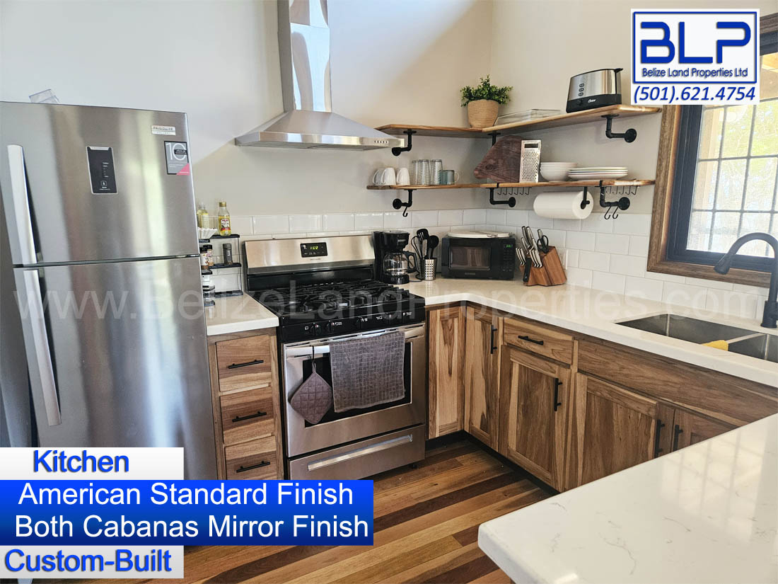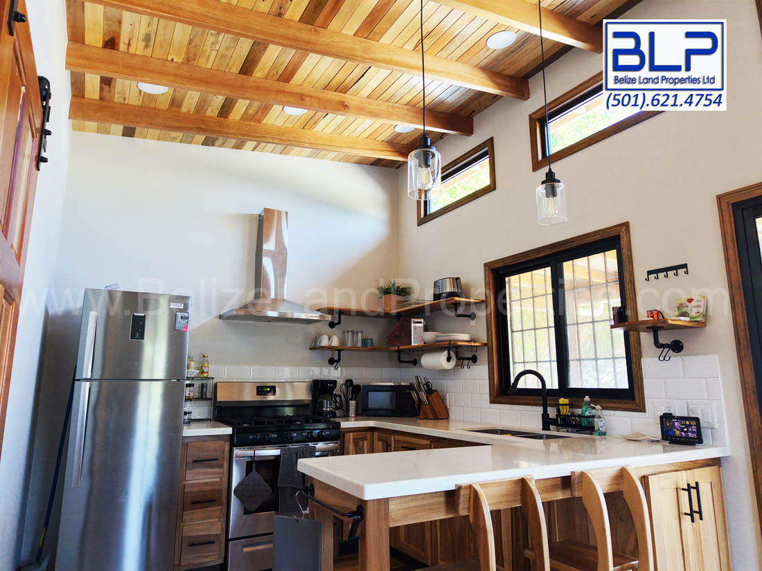 Throughout the interior of the cabanas there are various species of light-colored Belizean hardwoods are visible and with exposed ceiling rafters.  The interior walls have a great drywall finish.  All finishes, lights, faucets, fixtures, and lighting are to American standards.
