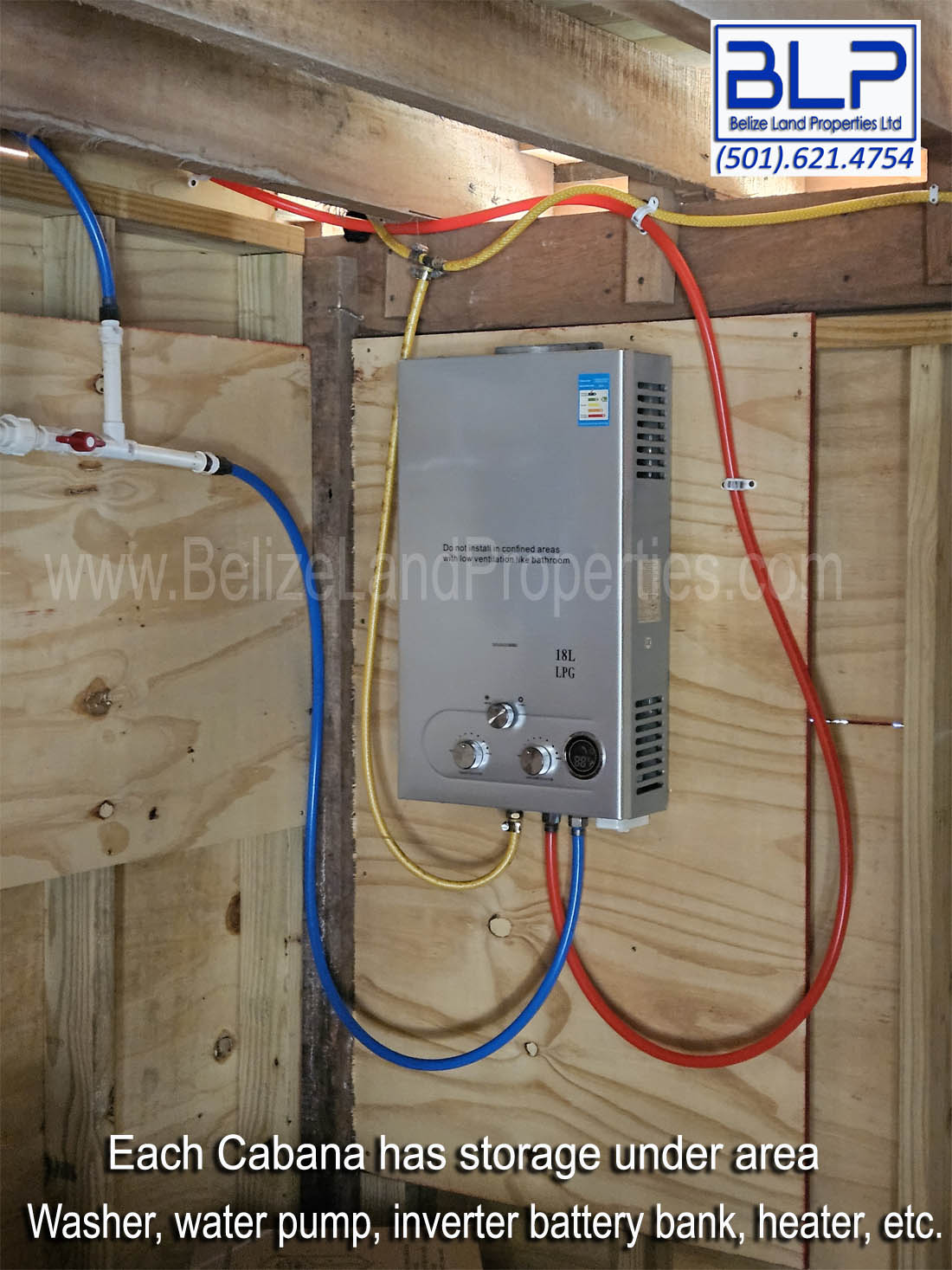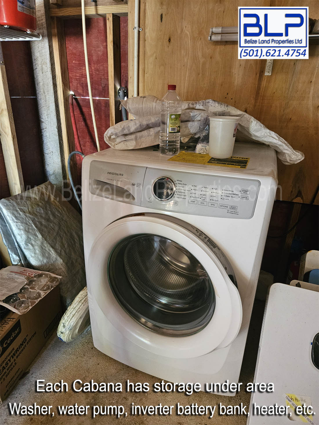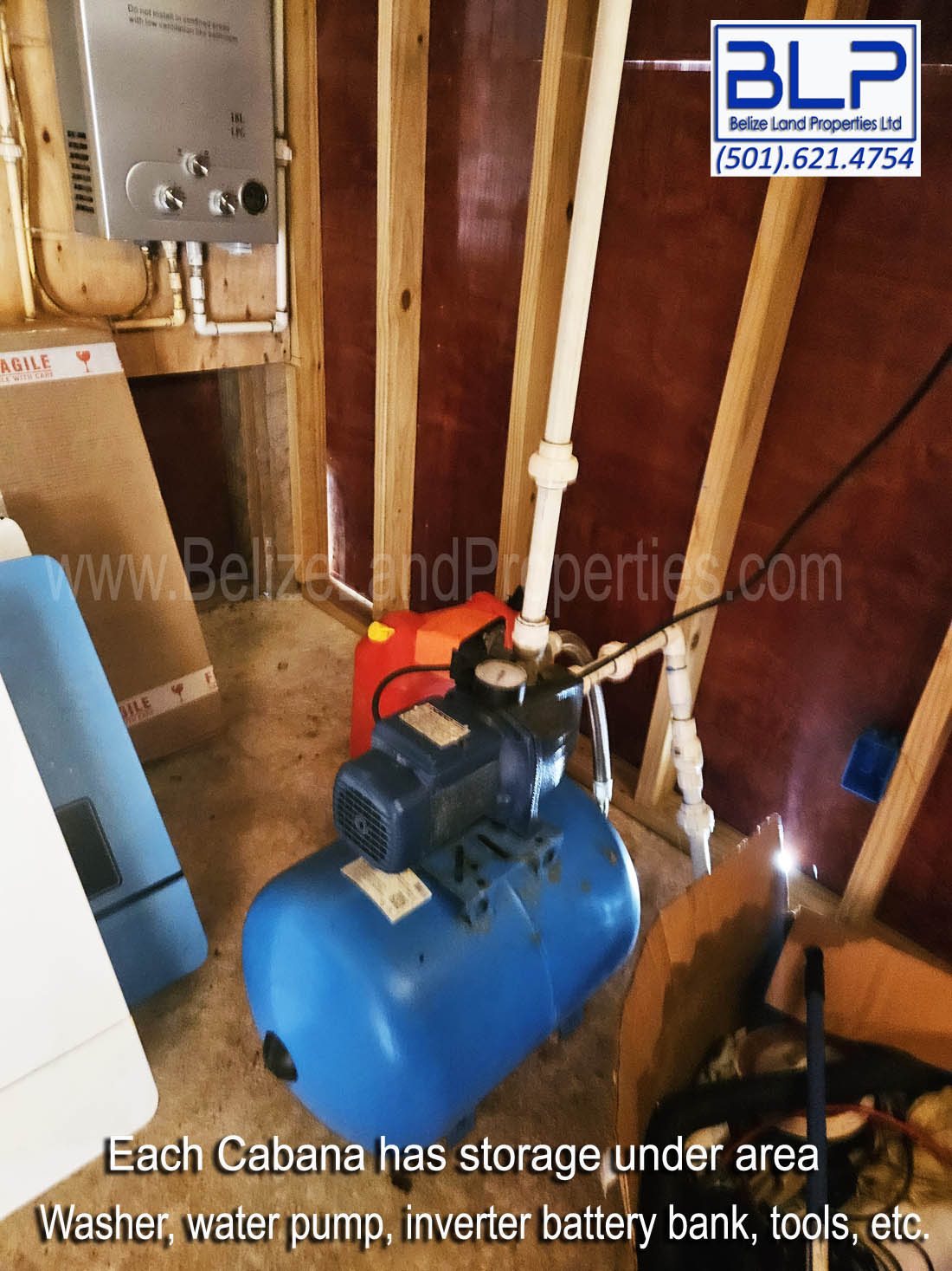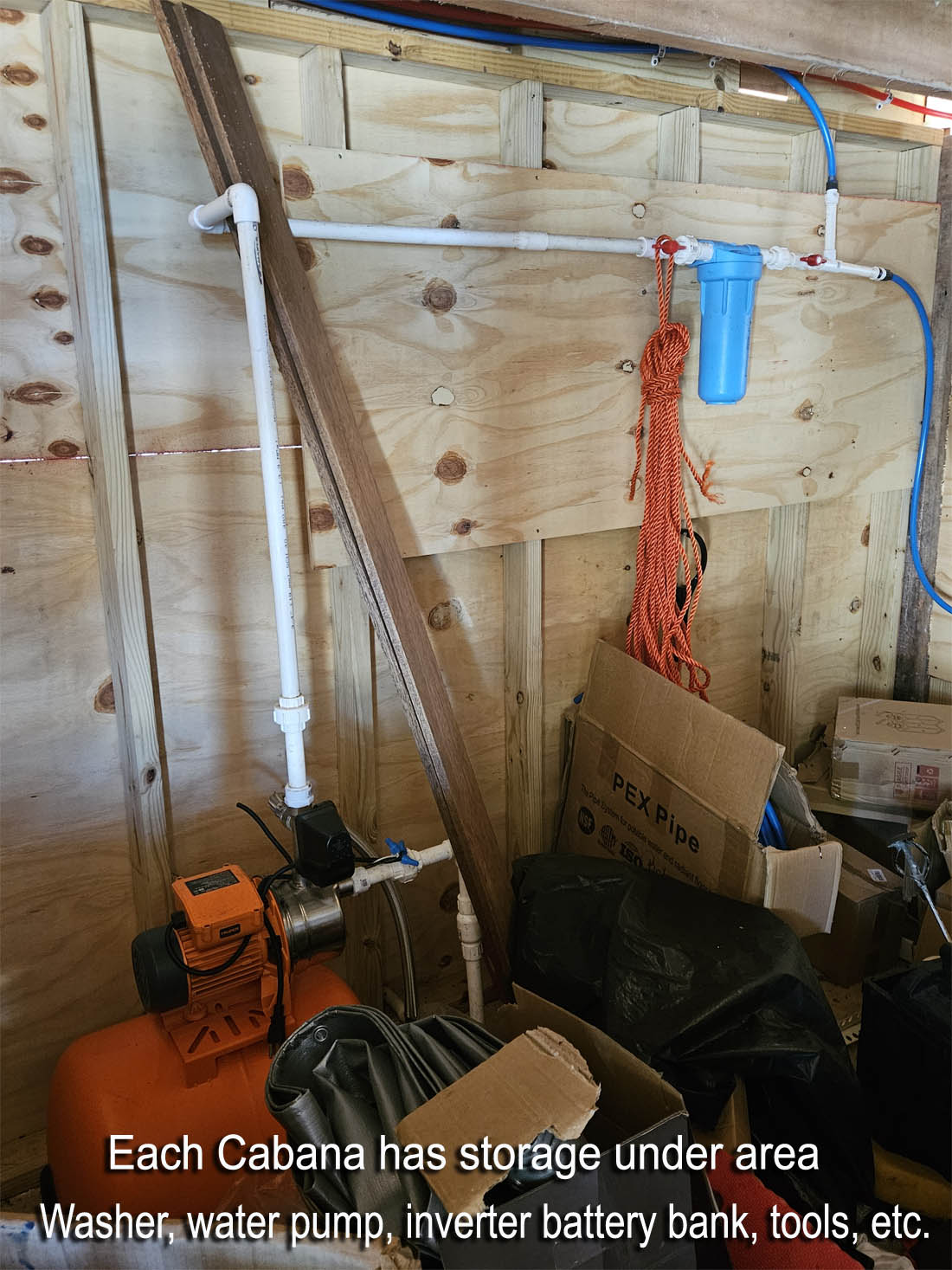 Both cabanas are on stilts and approximately 7 feet above ground.  Additionally, an enclosed warehouse area for storage of the solar inverter, solar battery bank, and each has an on-demand water heater and water pump, and a 6.5 gas-powered back-up generator.