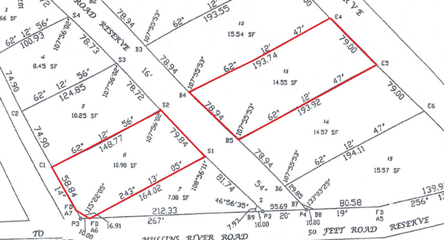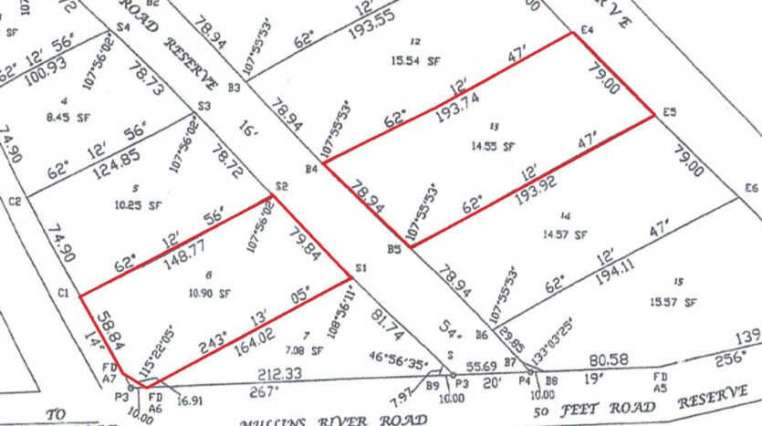 Beach view Lot 6:           79.84 ft (road reserve frontage) x 148.77 ft x 58.84 ft (plus 16.91 ft) x 164.02 ft