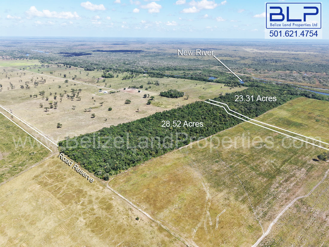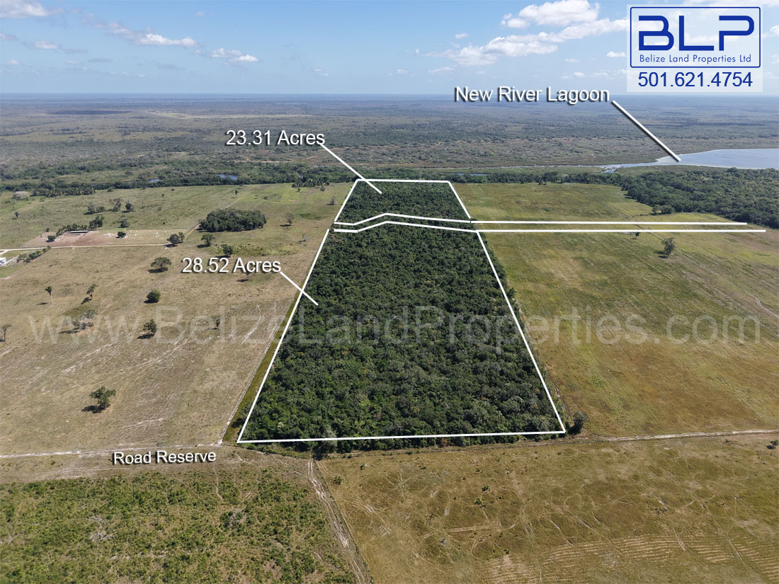 Parcel A (23.31 acres) boasts over 750 feet of direct frontage along the New River, providing a reliable water source and breathtaking views. The property sits just half a mile north of the New River Lagoon, one of Belize’s largest freshwater bodies. For those seeking tourism potential or a unique commute, the world-renowned Lamanai Mayan Ruin is a quick 1.6-mile boat ride away.